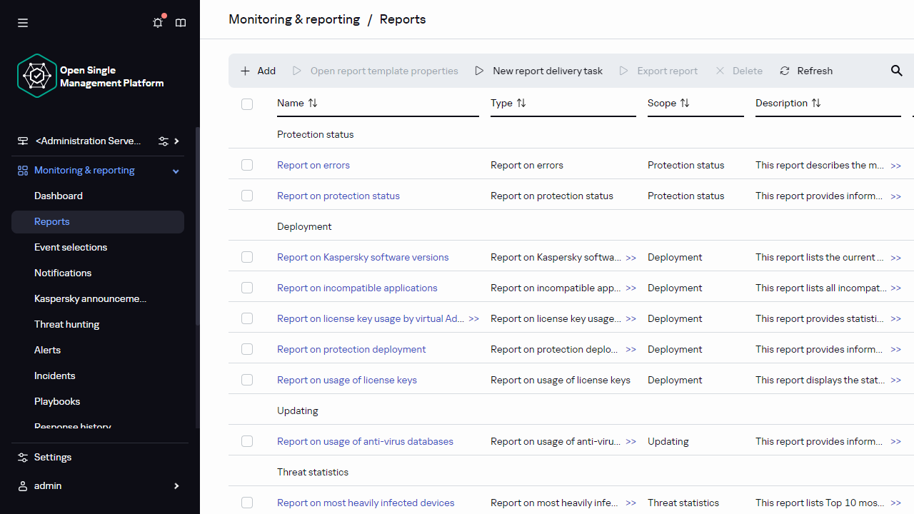 On the Scope step of the wizard, select the set of client devices (administration group, device selection, selected devices, or all networked devices) whose data will be displayed in reports that are based on this report template.